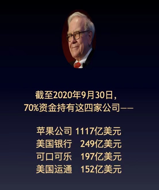 我们一起来看看,截至2020年9月30日,伯克希尔大约70%资金重仓持有四个公司股票——